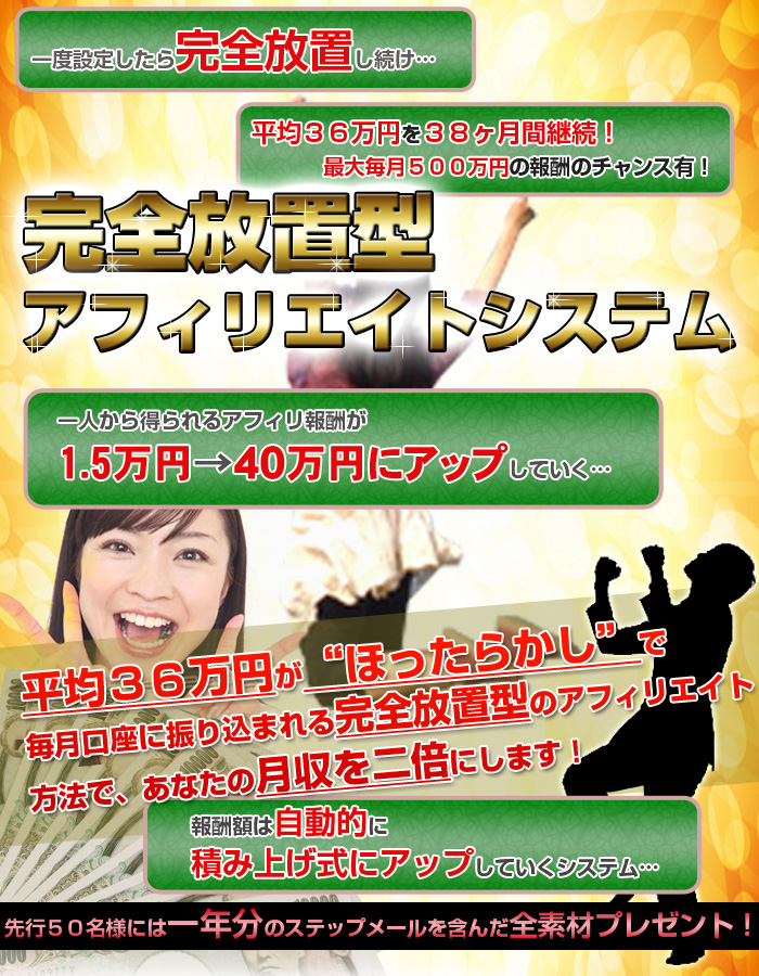 完全放置型アフィリエイトシステム 平均38カ月間連続36万円収入 最大500万円獲得!こちらのブログから、完全放置型アフィリエイトシステムをお申込された方には、